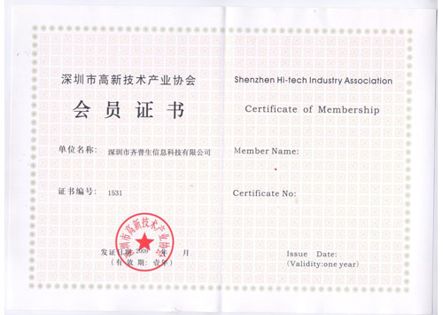 • 深圳市高新技術(shù)產(chǎn)業(yè)協(xié)會會員證書