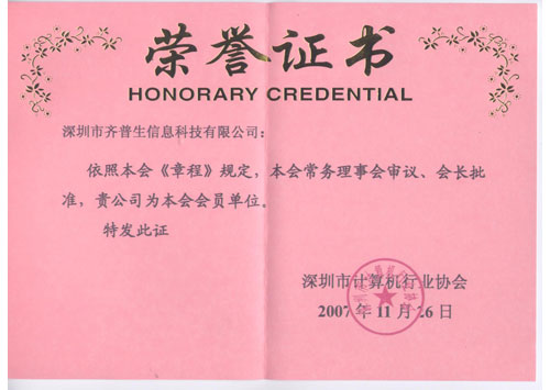 • 計算機行業(yè)協(xié)會會員榮譽(證書)